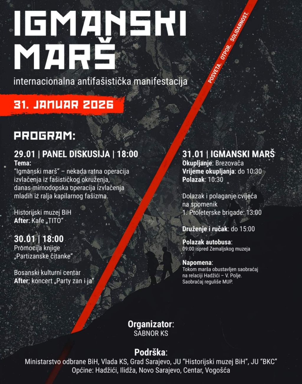 Pozivamo članove našega udruženja da se prijave za Igmanski marš, koji će se održati dana 31.01.2026.godine. Polazak autobusa ispred Zemaljskog muzeja u 09.00 sati dana 31.01.2026.godine. Članovi koji žele marširati izlaze iz autobusa u Brezovači u 10.30 sati, marš od Brezovače do Velikog polja na Igmanu traje oko 2 sata i 30 minuta. Oni koji ne mogu marširati produžavaju autobusima do Velikog polja.